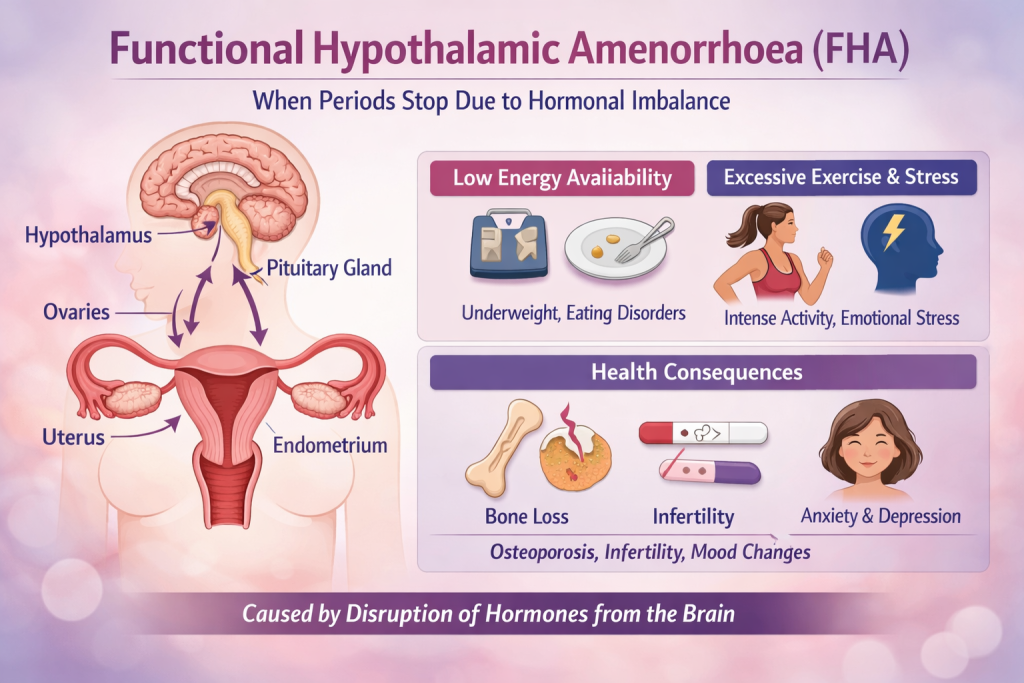 Periods can stop due to conditions affecting the hypothalamus, pituitary gland, ovaries, uterus, cervix, or vagina. In FHA, the hypothalamus reduces or stops releasing the hormones needed to stimulate the ovaries. As a result, the ovaries do not produce enough estrogen and progesterone, and the uterus is not stimulated to shed its lining—so periods stop.